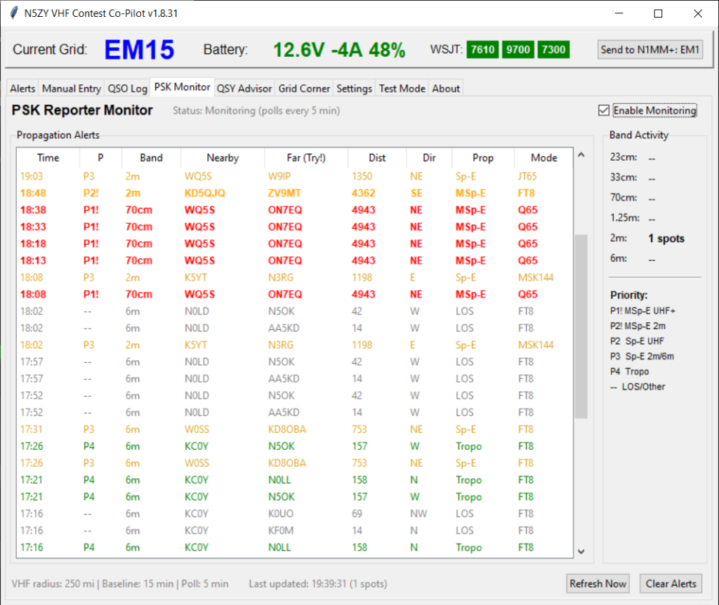 The PSK Monitor contains query results of PSK Reporter for VHF activity, how far approximately a QSO was made and the distance, direction and WSJT mode.