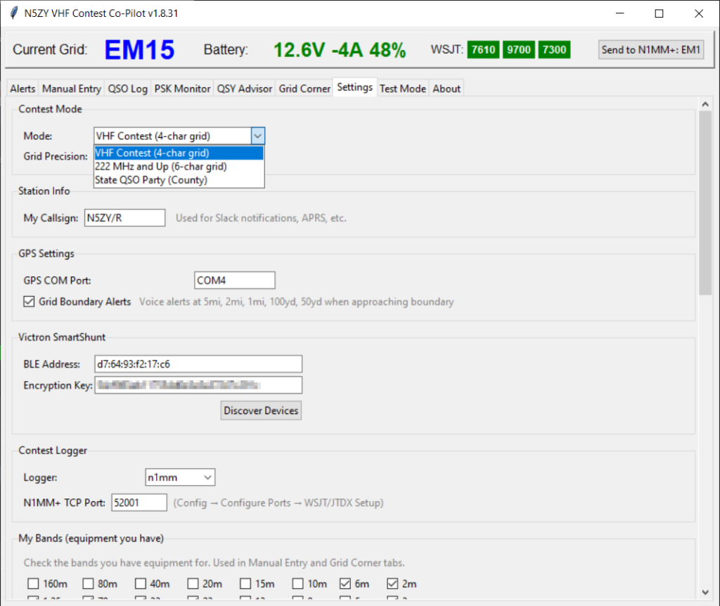 The settings tab is where you configure the contest mode, your callsign, the GPS port, what bands you have, and your contest logger (N1MM or N3FJP).