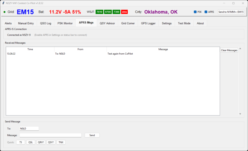 Co-Pilot connects to APRS-IS over the internet (I use Starlink — no RF conflict with 2m contesting). You can send and receive APRS messages to coordinate with other rovers, with quick reply buttons for common exchanges: 73, QSL, QRV?, QSY?, TNX. Incoming messages trigger a voice alert.