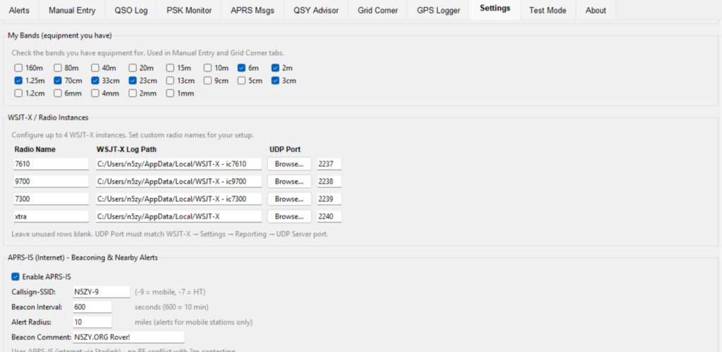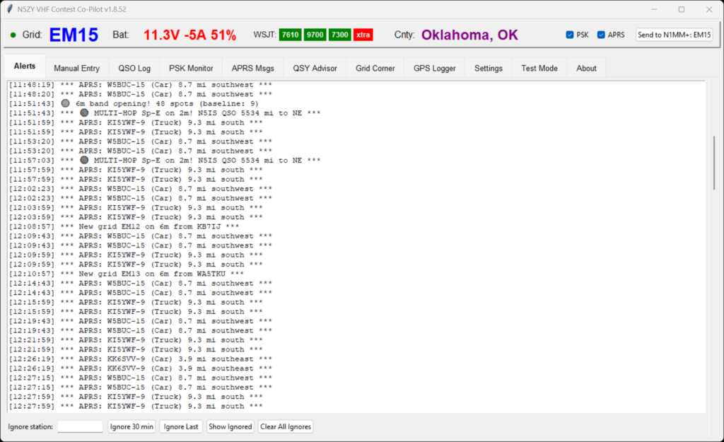 The Alerts tab is your real-time event feed. Every alert from every subsystem flows here: PSK Reporter propagation detections, APRS nearby station alerts, new grid spots, band openings, and county changes. The Ignore station feature lets you temporarily silence specific callsigns — those “WSJT alligators” who call CQ endlessly but never respond.