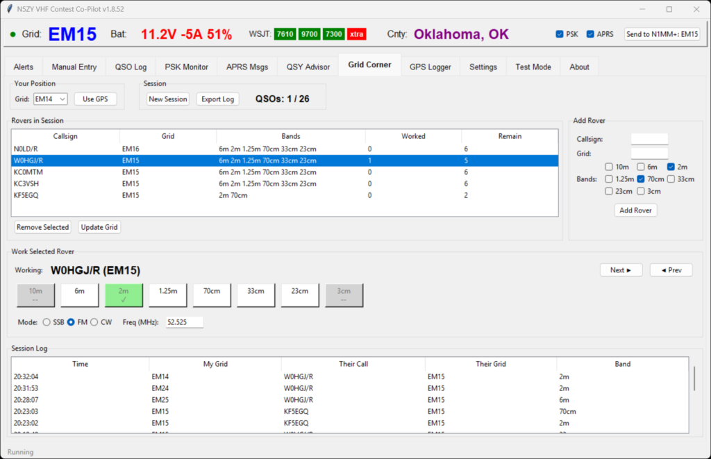 The Grid Corner tab solves this. Add each rover with their callsign, starting grid, and bands. Select who you’re currently working, and the band buttons let you log each QSO with a single click. Buttons turn green when worked. When you or they move to a new grid, hit “Update Grid” and the buttons reset. The session tracks your progress (1/26 in this screenshot) and the session log at the bottom keeps a running record. Export the entire session to ADIF when you’re done.