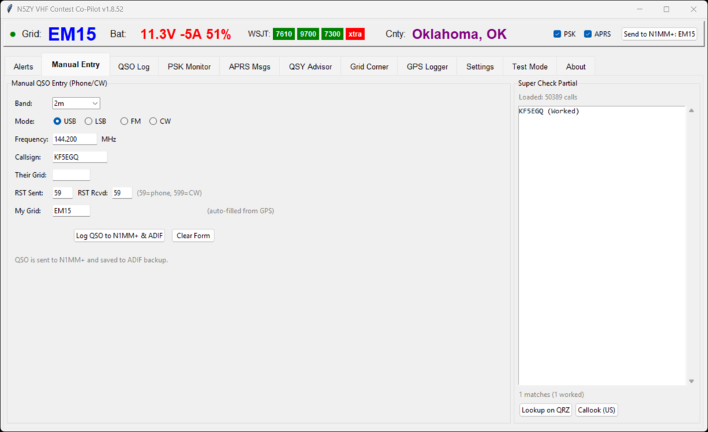 For phone and CW contacts that don’t go through WSJT-X, the Manual Entry tab gives you band selection (populated from your “My Bands” configuration), mode buttons (USB/LSB/FM/CW), and auto-filled frequency. The Super Check Partial panel on the right loads 50,000+ callsigns and shows matches as you type each character. Already-worked stations are marked “(Worked)” so you can quickly tell if this is a new multiplier.