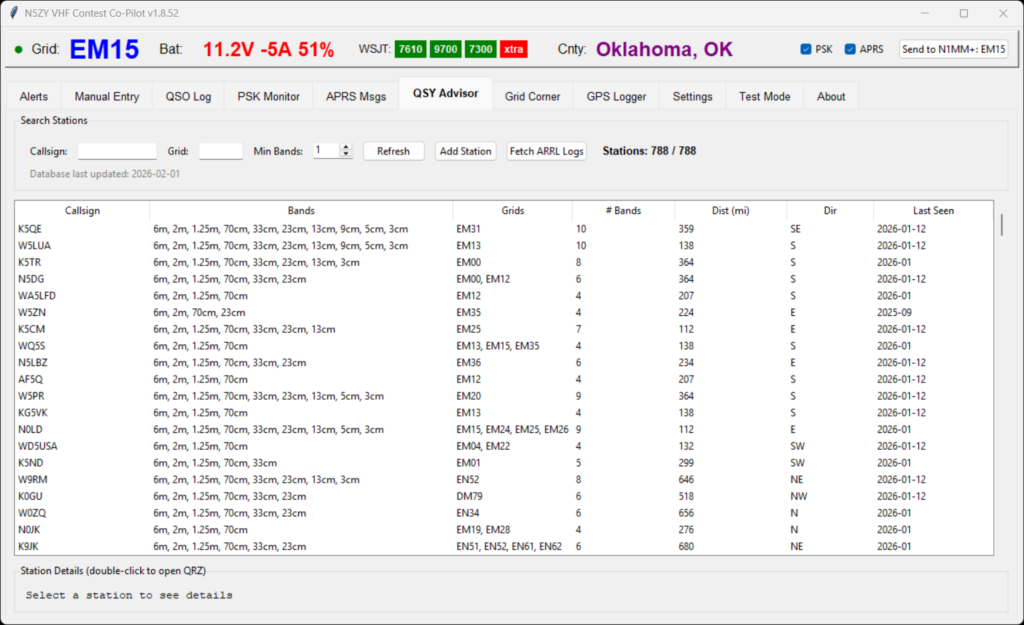 The QSY Advisor downloads 24 months of ARRL VHF contest public logs and builds a database of active stations — currently 788 entries. For each station you can see their callsign, which bands they’ve activated in prior contests, the grids they’ve operated from, distance and bearing from your current GPS position, and when they were last seen.