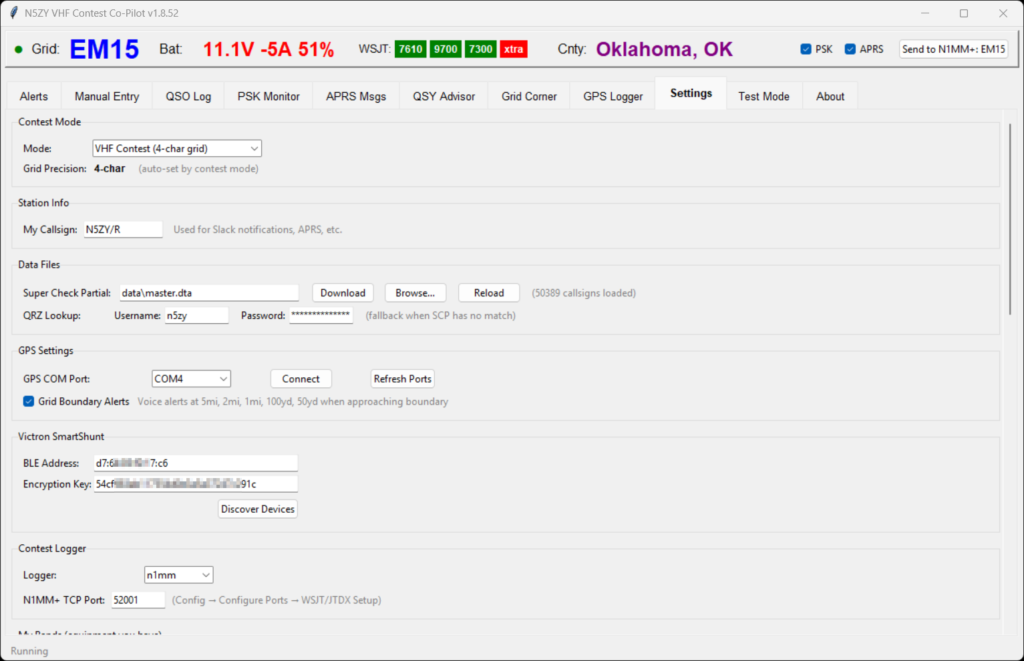 Contest mode, station info, data files (SCP + QRZ credentials), GPS, Victron SmartShunt, and contest logger selection.