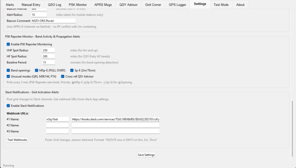 PSK Reporter settings let you configure VHF and HF spot radius, baseline period for opening detection, and which alert types are enabled — including the “MSp-E (PULL OVER!)” alert. Slack Notifications post grid changes to configured webhook channels in the format “N5ZY/R now in EM15 on 6m, 2m, 70cm” so chasers know where you are.