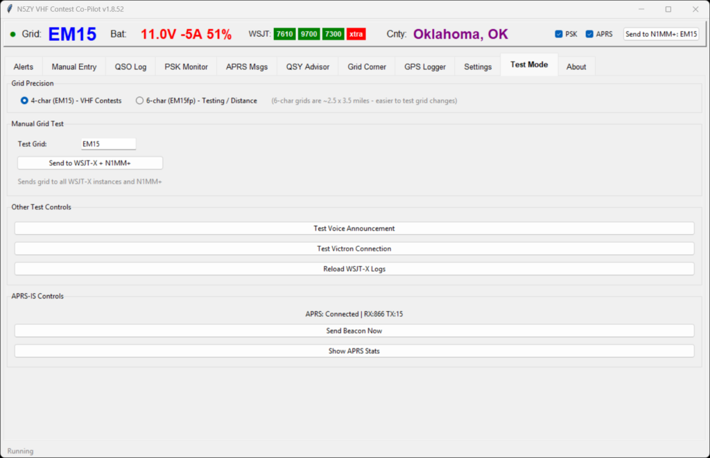 The Test Mode tab lets you validate every integration without going mobile. Toggle between 4-character (VHF contest) and 6-character (222 and up testing) grid precision, send manual grid updates to all WSJT-X instances and N1MM+, test voice announcements, verify Victron BLE connectivity, reload WSJT-X logs, and send APRS beacons on demand.